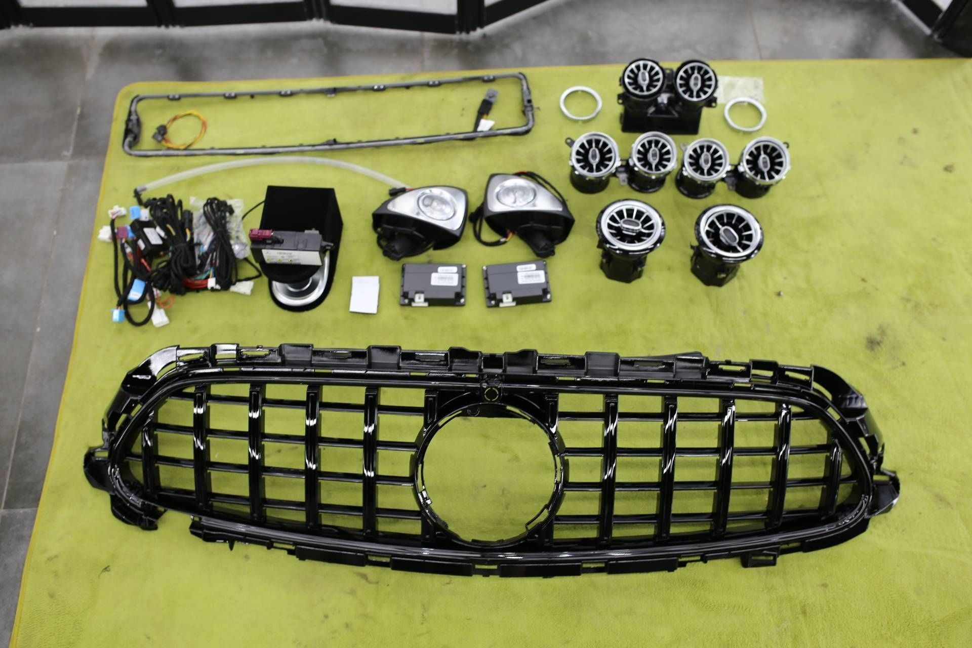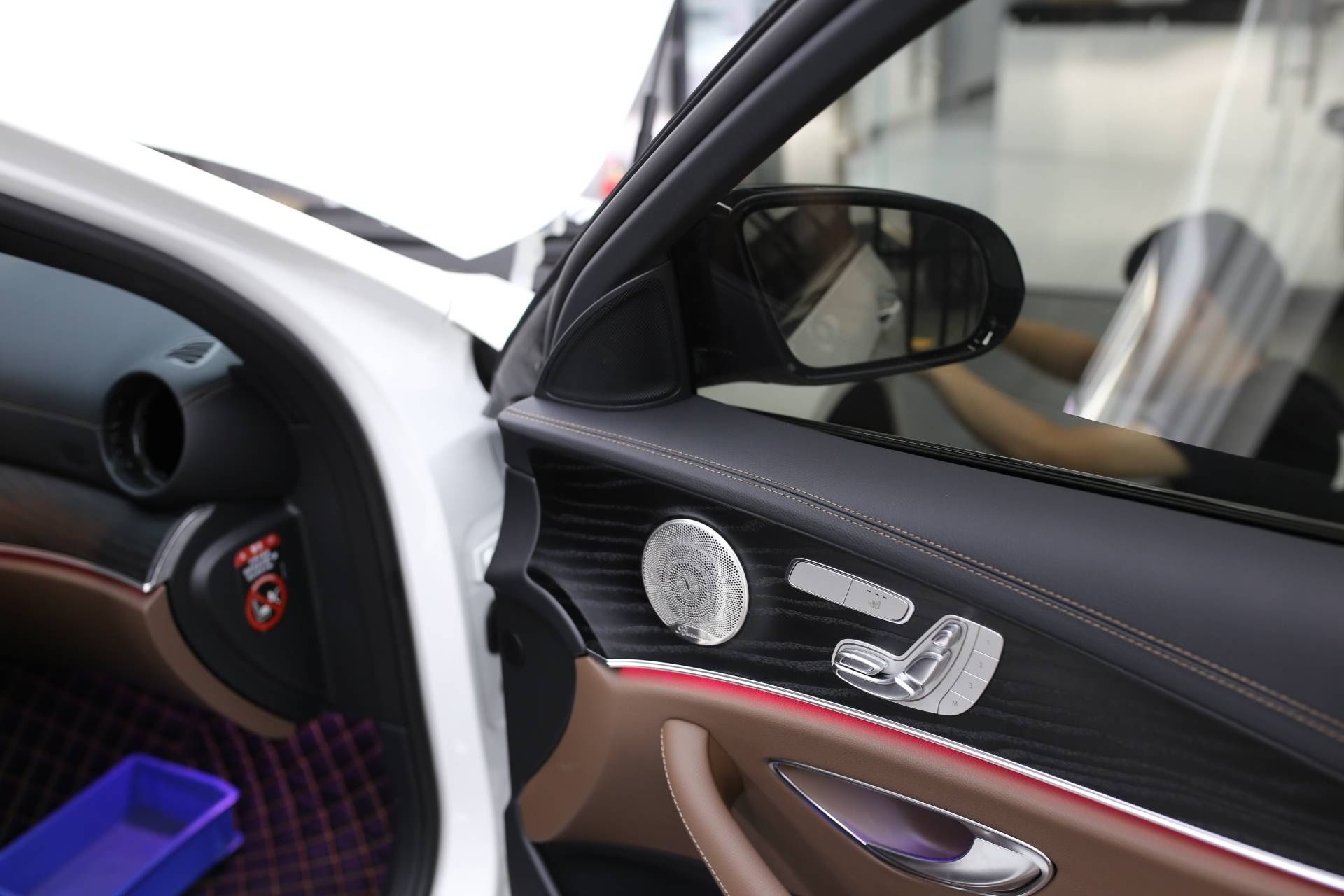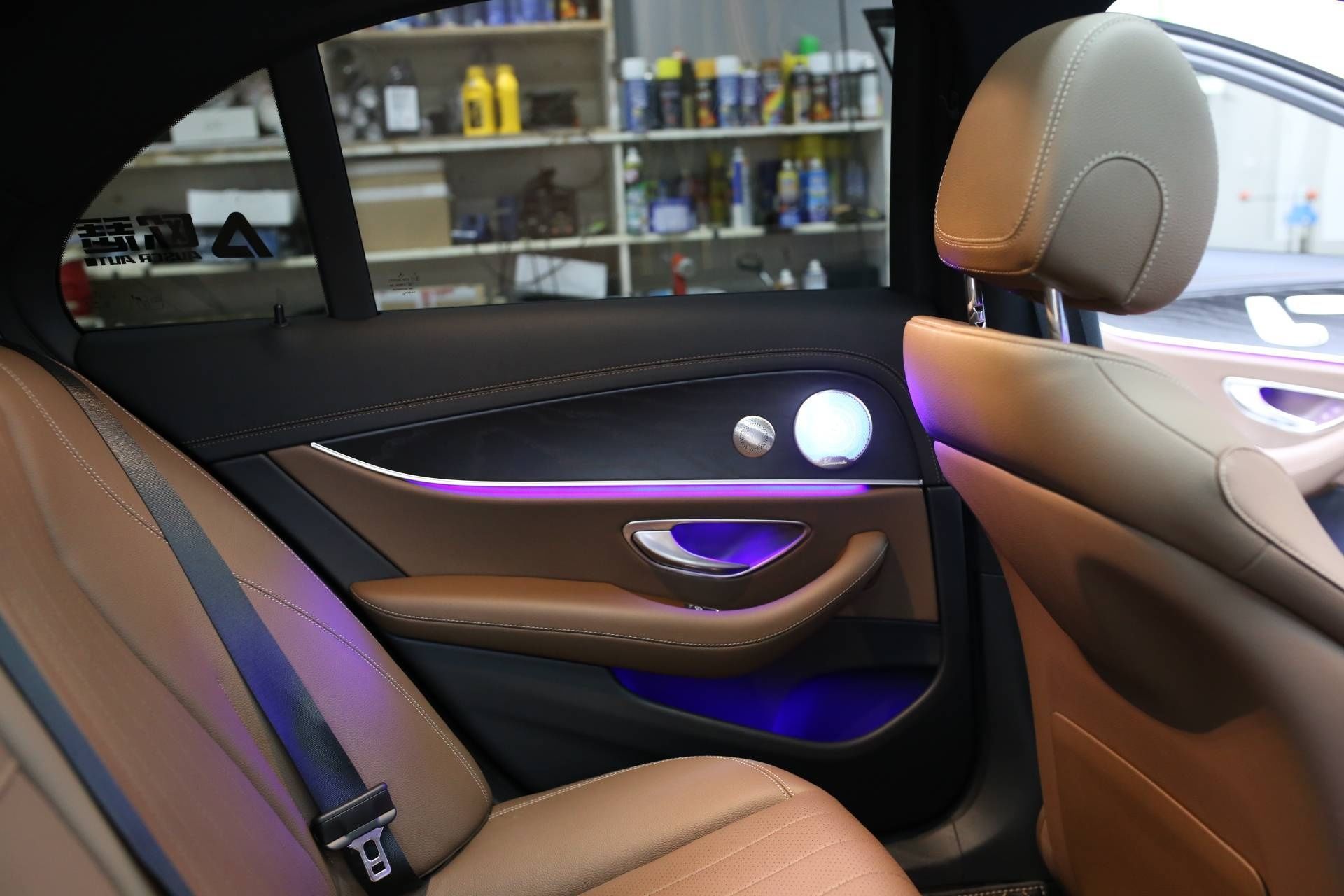 这个车主来店升级,给自己的爱车定制了由内到外的升级方案。里面选择升级网红发光三件套,也就是发光涡轮出风口、旋转高音和发光盖板,是提升车内氛围的神器,也是大家最爱升级的项目之一。除此之外还有香氛负离子和新款E级少了的屏幕氛围灯条。外面换个AMG的黑色中网,贴个必备车衣把车漆保护起来,然后再改个颜色。