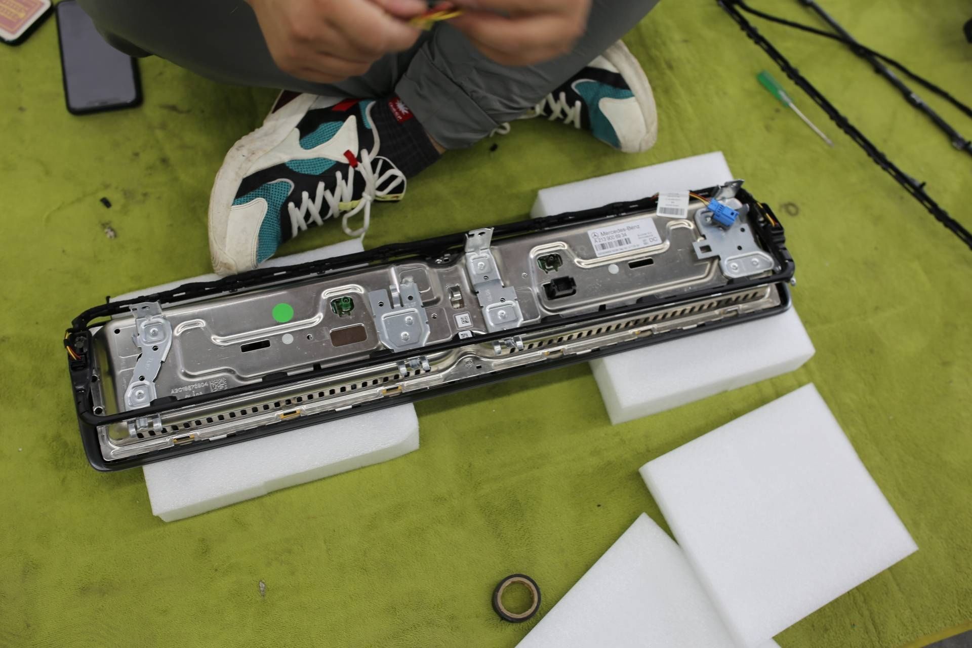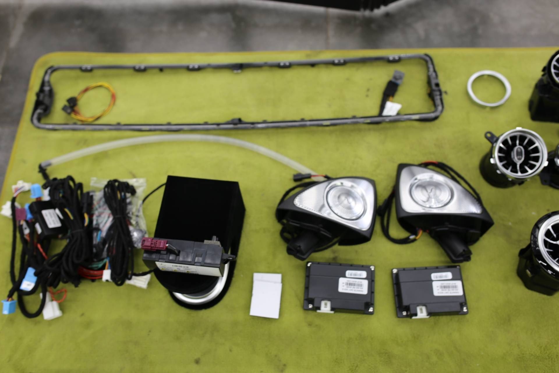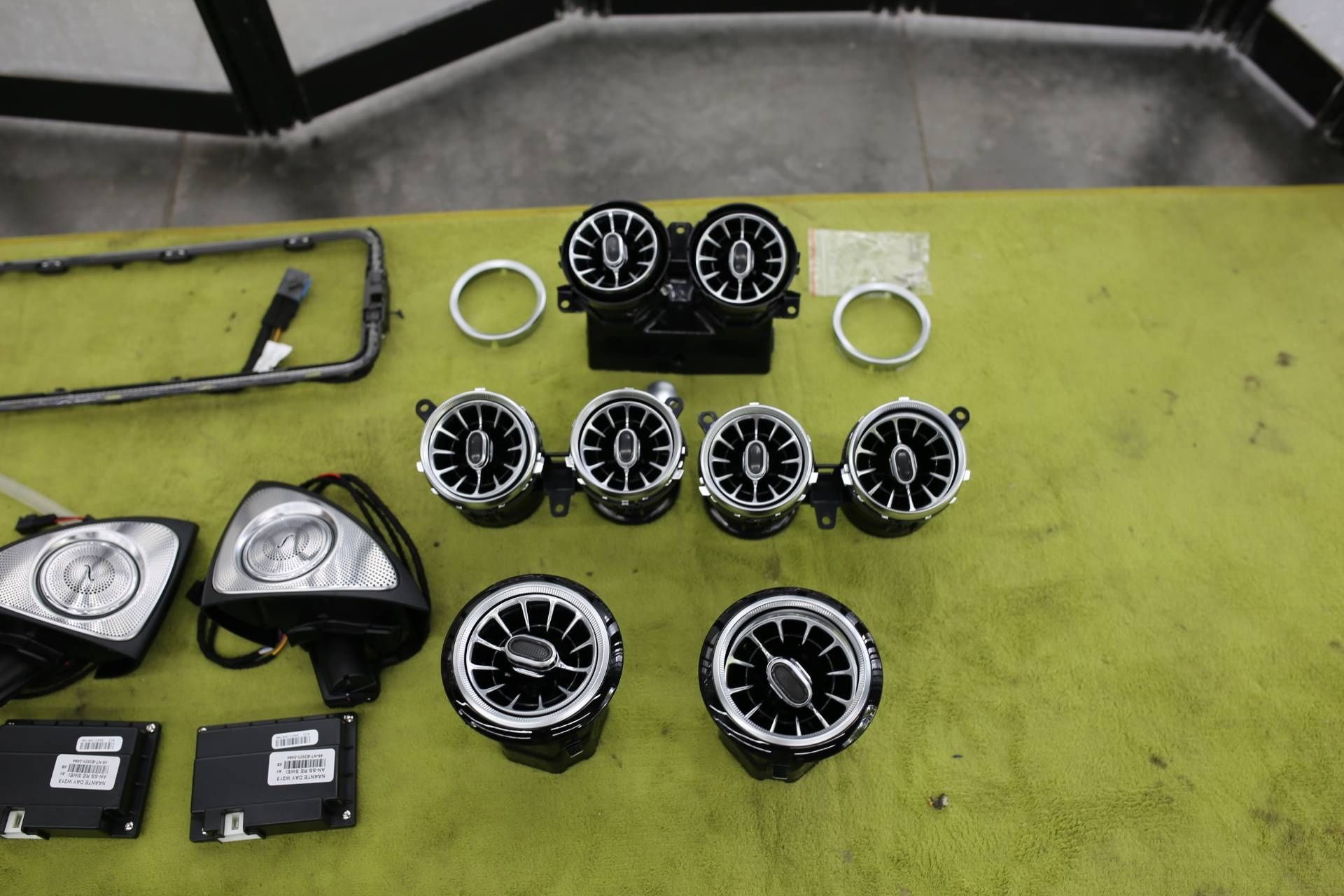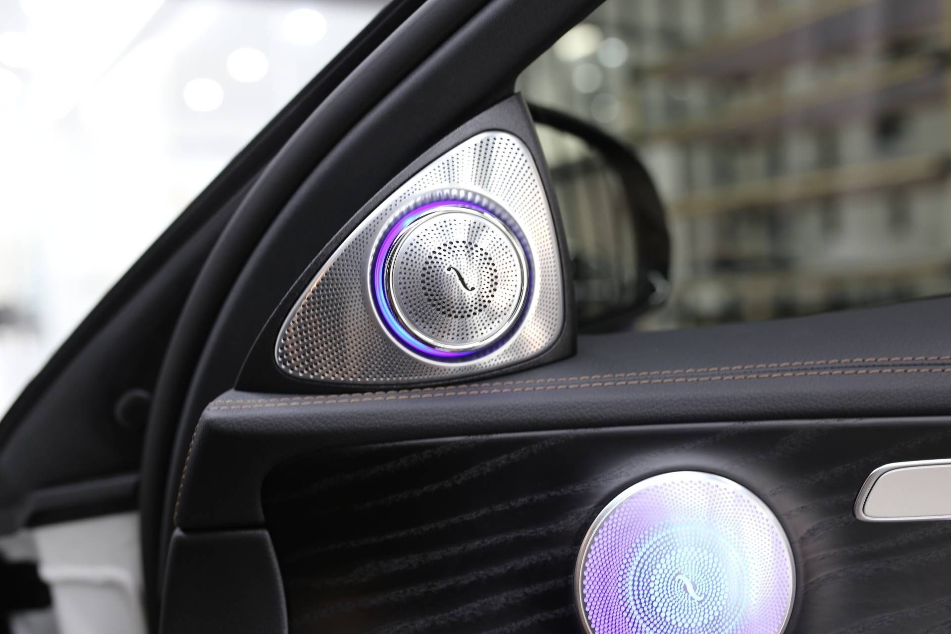 这个车主来店升级,给自己的爱车定制了由内到外的升级方案。里面选择升级网红发光三件套,也就是发光涡轮出风口、旋转高音和发光盖板,是提升车内氛围的神器,也是大家最爱升级的项目之一。除此之外还有香氛负离子和新款E级少了的屏幕氛围灯条。外面换个AMG的黑色中网,贴个必备车衣把车漆保护起来,然后再改个颜色。